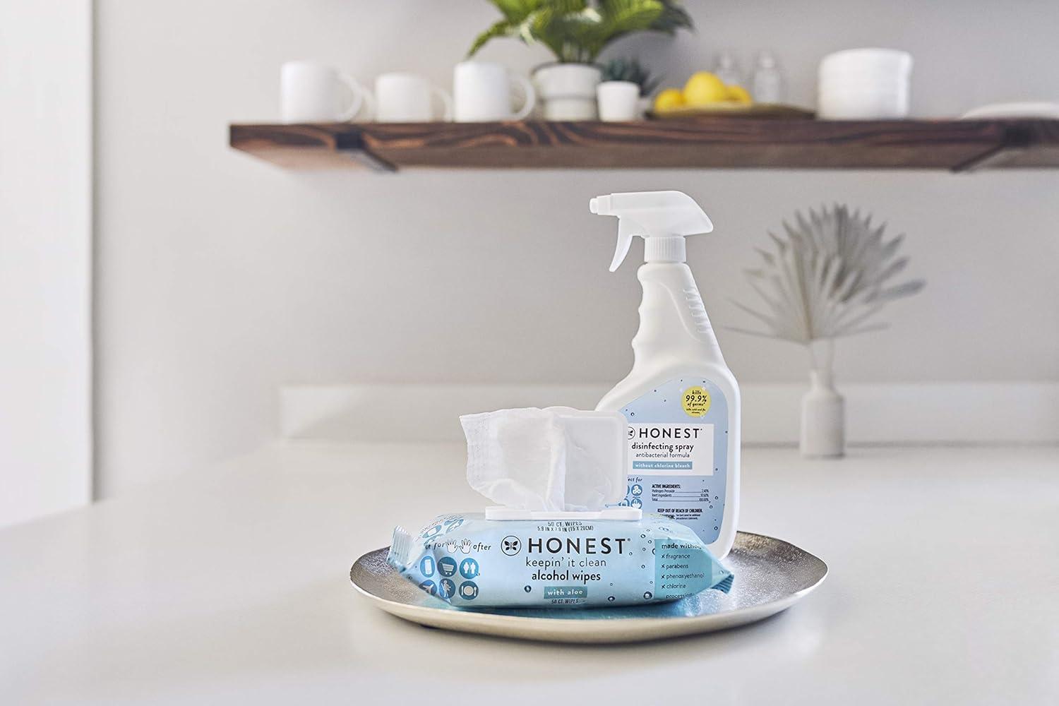 Our powerful 3-in-1 antibacterial disinfecting spray that cleans, deodorizes and disinfects all in one step. Kill 99.9% of the germs* your fam comes in contact with daily, and effectively fight against the cold + flu viruses. Perfect for all the hard, non-porous surfaces around the home –your babe’s highchair, germ-ridden door knobs, and especially your cellphones – Honest Disinfecting Spray is made without fragrance, chlorine bleach, harsh abrasives, phosphates, fumes and harsh chemicals because you shouldn’t have to choose between a clean home and what’s good (aka safe) for you. How to Use: It is a violation of Federal law to use this product in a manner inconsistent with its labeling. To Operate: Turn nozzle to preferred usage. To Clean and Deodorize: Spray on surface until thoroughly wet, then wipe clear. No rinsing required. To Disinfect: Spray on surface thoroughly wet. Let stand for 10 minutes then wipe clean. Ingredients: Water (7732-18-5), Hydrogen Peroxide (7722-84-1), Surfactant Blend, Citric Acid (77-92-9), Alkylbenzene Sulfonic Acid (68584-22-5) CAUTION: Not recommended for use on porous surfaces, marble, wood, brass, or painted surfaces. For all surfaces, test a small, inconspicuous area first. Causes moderate eye irritation. Avoid contact with eyes or clothing. Wash thoroughly with soap and water after handling. *Kills 99.9% of Influenza A H1N1 Virus, Rhinovirus, Escherichia coli, Listeria monocytogenes, Pseudomonas aeruginosa, Salmonella enterica, Staphylococcus aureus, Methicillin-resistant Staphylococcus aureus (MRSA), and Trichophyton mentagrophytes on hard, non-porous surfaces in 10 minutes.